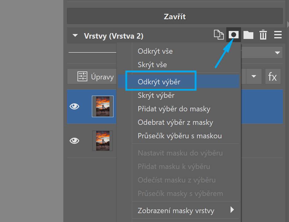 Dále na duplikované horní vrstvě klikněte na Odkrýt výběr. V horní vrstvě vám tedy zůstane jen popředí.