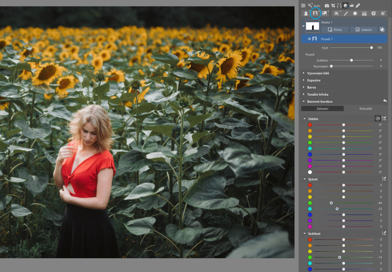 Pokud na fotce tvoří pozadí zeleň, strhává na sebe spoustu pozornosti. Pokud ji lehce potlačíte, vynikne více portrétovaná osoba. Otevřete fotku v Zoner Studiu v modulu Vyvolat. Pro přesnější výsledek přepněte do Lokálních úprav (L) a zvolte Pozadí. Pak už stačí jen v Barevných korekcích najít odstíny zelené a snížit jejich sytost.