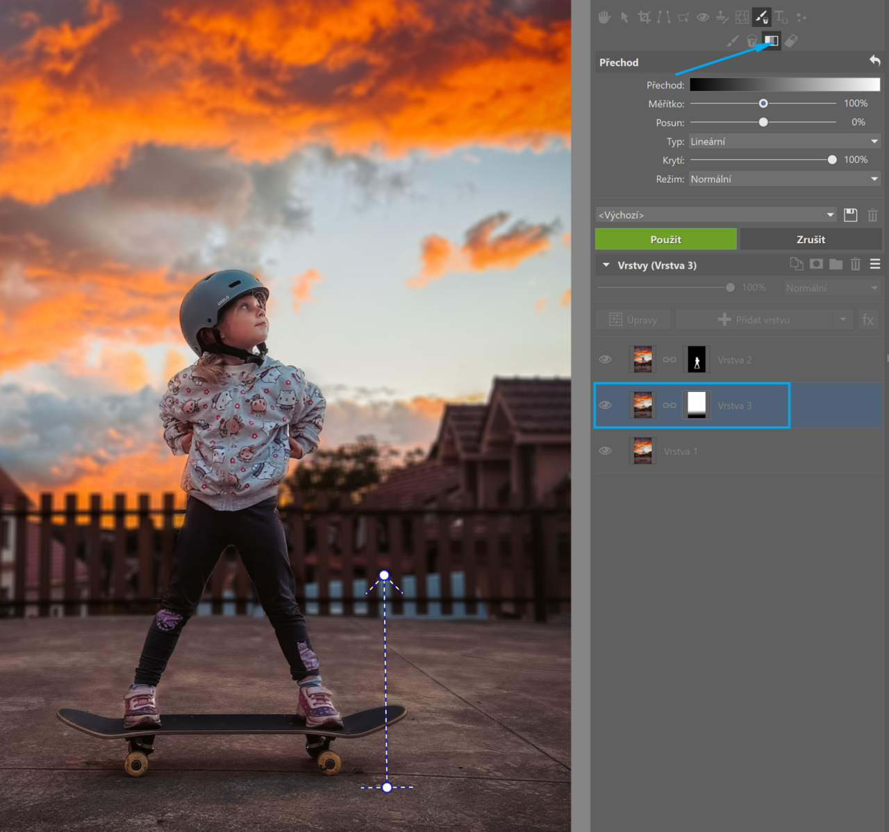 U běžných portrétů, kde není vidět zem, by bylo hotovo, ale v našem případě nedává smysl, aby bylo rozmazané všechno i těsně pod objektem, protože je zem ve stejné rovině ostrosti. Takže potřebujeme ze spodní části ostrost odstranit. To je velmi jednoduché, přidáte vrstvě masku kliknutím na ikonu masky a zvolíte Odkrýt vše. Přepnete se nahoře do Kreslicích nástrojů, zvolte Přechod a natáhněte ho zespodu nahoru. Klikněte na Použít a máte hotovo.