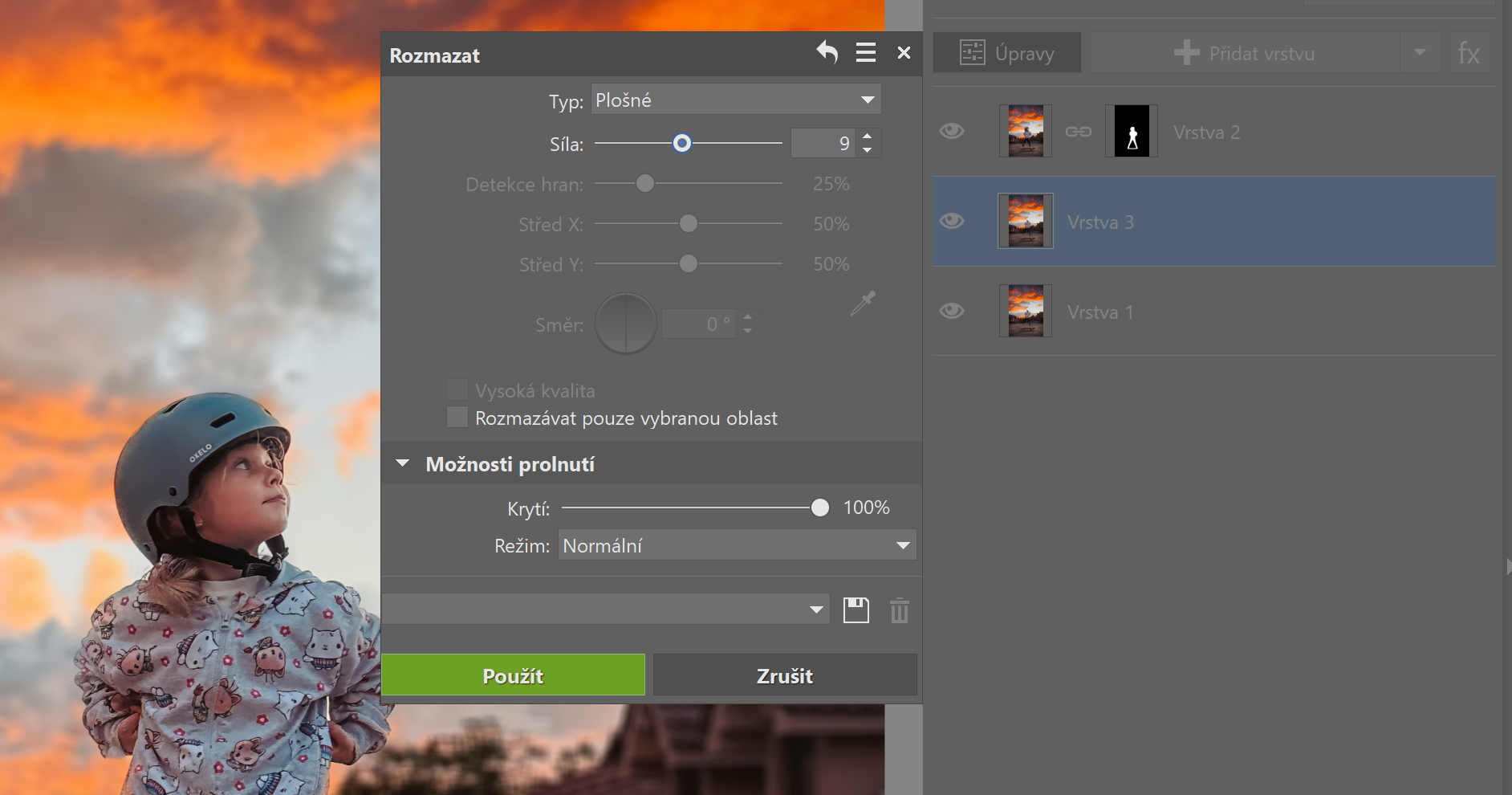 Vyberte typ rozmazání, obvykle je nejlepší použít Plošné nebo Gaussovské rozmazání. A určete pomocí Síly, jak výrazné má rozmazání být.