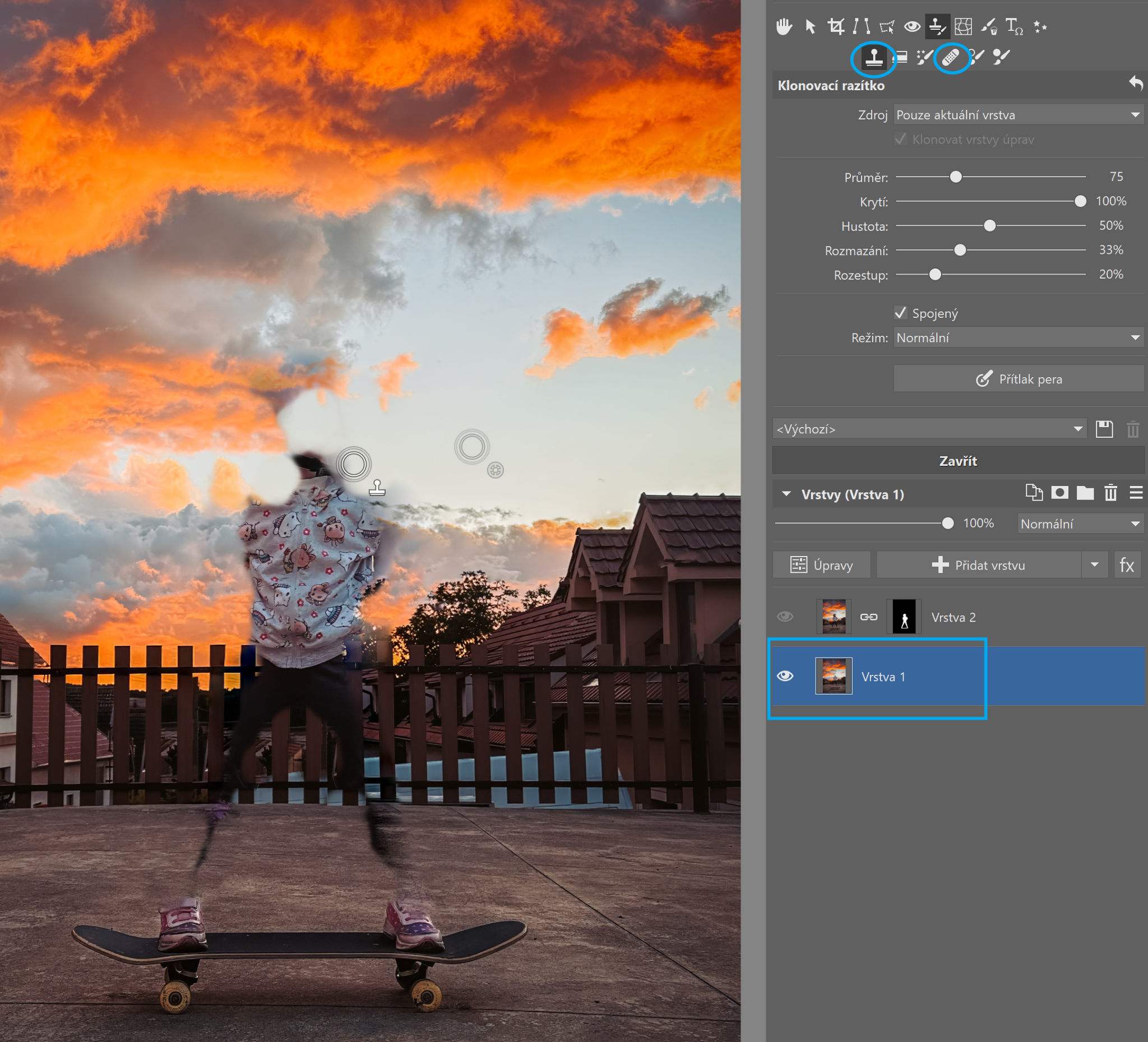 Překlikněte do spodní vrstvy. Aby byl výsledek co nejlepší, musíte odretušovat okraje objektu, protože by pak dělaly problém při rozmazávání. Nejlépe na to funguje Klonovací razítko (S) nebo Retušovací štětec (J). Pro pohodlnější práci si skryjte horní vrstvu pomocí ikony oka u vrstvy.