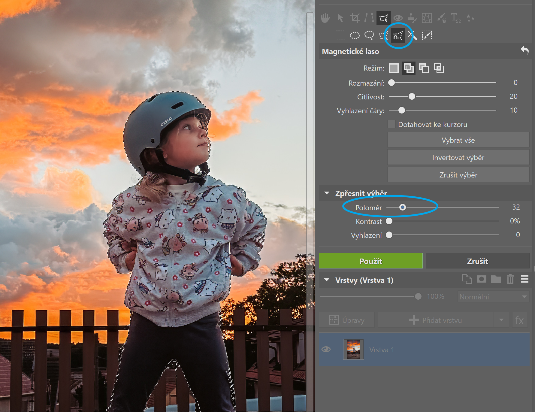 Fotku, u které chcete rozmazat pozadí, si otevřete v modulu Editor. Vrstvu se snímkem zduplikujte a pomocí výběrových nástrojů vyberte celou postavu. Zpravidla se k tomu nejvíc hodí Magnetické laso (A). Výběr poté ještě můžete doladit pomocí funkce Zpřesnit výběr.