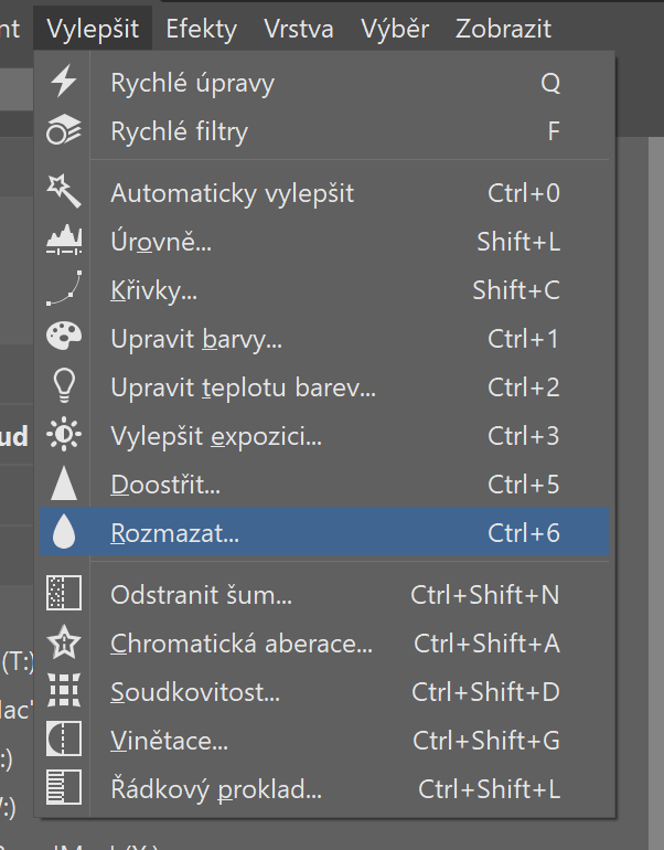 Opět zviditelněte horní vrstvu a v horní nástrojové liště najděte záložku Vylepšit a zde vyberte Rozmazat.