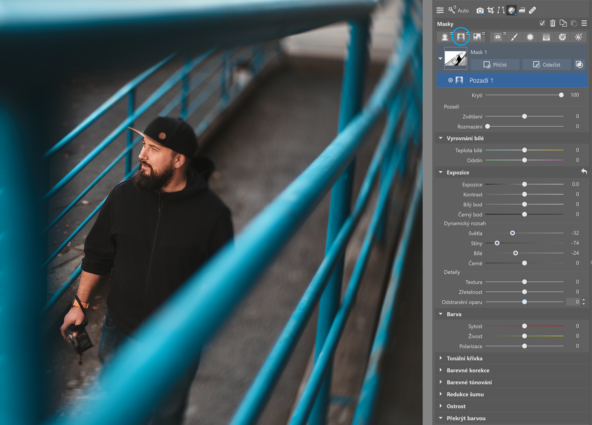 Další situací, která často nastává, je, že fotka je trochu „plochá“ a hlavní subjekt nevynikne, protože je stejně světlý nebo tmavý jako zbytek fotky. K vyřešení tohoto problému je ztmavení pozadí (nebo naopak zesvětlení hlavního objektu). Přepněte do Vyvolat a vyberte v Lokálních úpravách (L) Pozadí. V sekci Expozice snižte Světla, Stíny, případně Expozici – podle toho, co na vaší konkrétní fotce vypadá nejlépe.