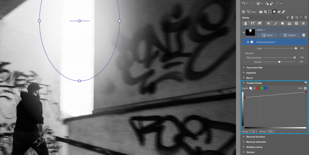 Další zajímavá úprava Kruhovým přechodem je přidání světla do míst, kde by se ho hodilo více. Úprava by měla být uvěřitelná, takže umístěte kruh tam, kde by opravdu světlo mělo být. Důležité je nastavit co největší Šířku přechodu, aby rozzáření bylo plynulé.