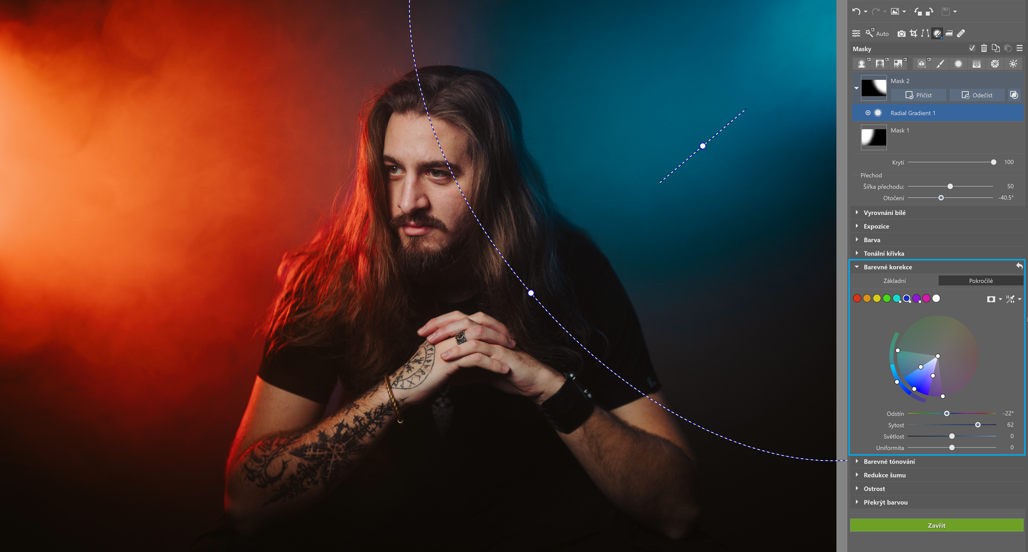 Klasický posun barev najdete v moduluVyvolat v sekci Barevné korekce. Tyto úpravy ale můžete provádět i lokálně. Začněte tím, že použijete Kruhový přechod (R) a určíte jeho velikost a Šířku přechodu.