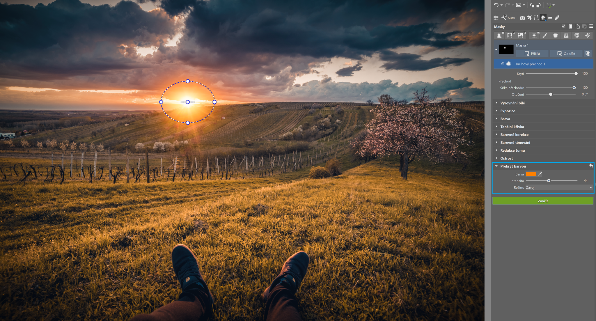 Kruhovým přechodem tentokrát označte pouze slunce a jeho okolí. V sekci Barva zadejte některý odstín oranžové barvy, kterou slunce může mít. Nastavte přiměřenou Intenzitu (například na obrázku níže je to kolem 40). Režim přepněte na Závoj a nastavte Šířku přechodu na maximum, aby byl efekt co nejplynulejší.