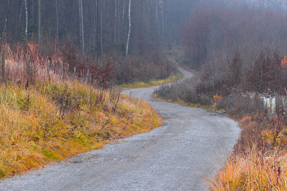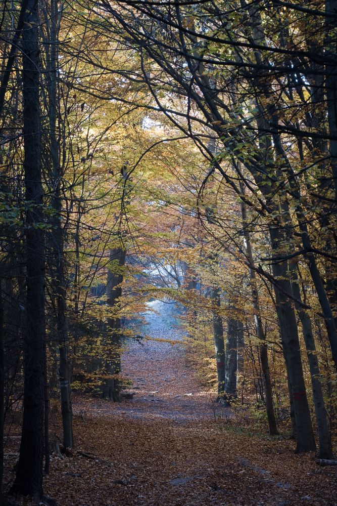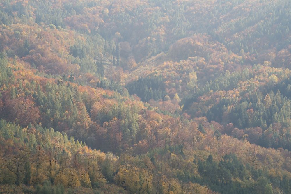 Na podzim, zejména z rána, je běžné, že vzdálenější kopce jsou v lehké mlze. Stále viditelné, ale fotoaparát je už zachytí s velmi malým kontrastem.