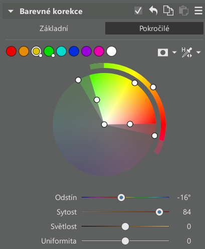 Pokud vám ani posun základních barev nepomohl, je tu ještě velmi cílená pomoc ve formě panelu Barevné korekce. Obecně popsáno zde vybíráte skupiny barev a měníte je na jiné. Nástroj je to přímočarý, ale možností jeho nastavení je hodně, proto vás jen odkážu na článek o barevných korekcích.