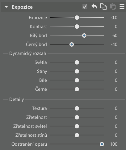 Opar přes celý záběr snadno přidáte přesným opakem postupu z minulé kapitoly. Takže buď stačí posuvník Odstranění oparu posunout doleva nebo použít kombinaci obou bodů a Černý bod táhnout doprava, zatímco Bílý bod doleva.