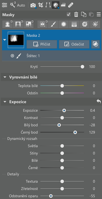 Obojí znamená využít nástroj Lokální úpravy, kde vytvoříte masku jedním z dostupných nástrojů, nejobvykleji Lineární přechod, Kruhový přechod nebo Štětec. Po vytvoření masky máte k dispozici opět stejné posuvníky pro odstranění oparu nebo posun bílého či černého bodu, jen budou omezené na určité místo.