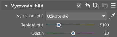 V obou případech je řešení nastavit posuvník Vyrovnání bílé na vyšší číslo. Jaké přesně bude, to je těžké odhadnout a záleží na konkrétní fotce, vašich kreativních záměrech a také na dalších použitých úpravách. Protože se můžete k tomuto nastavení kdykoliv později vracet, není potřeba zde situaci příliš analyzovat a jen zkuste nastavit hodnotu, která vám bude připadat hezká. U barevného listí se také vyplatí zkusit, jestli kromě posunu do žluté nebude vypadat lépe i s drobnou změnou Odstínu směrem k více fialovým barvám.