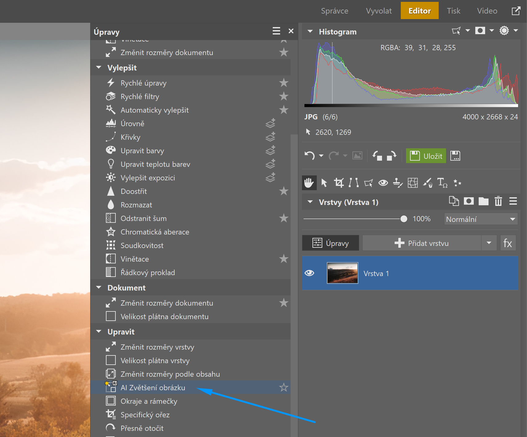 AI nástroje pro zvětšení fotek v Zoner Studiu to mění. Díky umělé inteligenci dokáže program rozpoznat tvary, hrany i textury a citlivě je zvětšit – nebo dokonce dopočítat chybějící detaily tak, že výsledek působí přirozeně a ostře. Zoner Studio nabízí dva různé přístupy, které můžete použít podle situace: