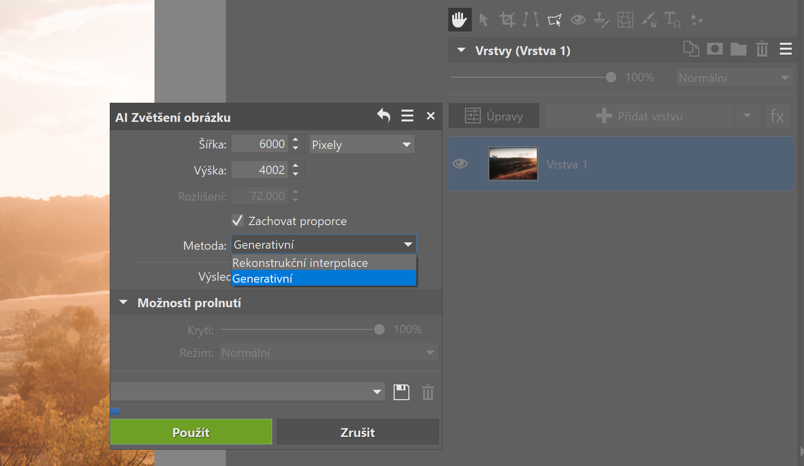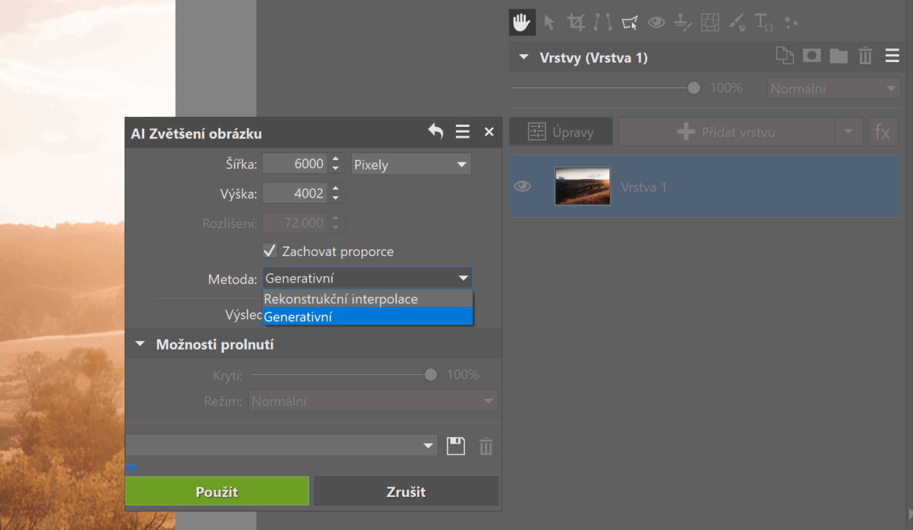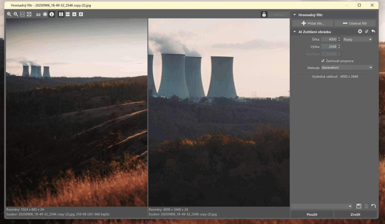 Generativní zvětšení se hodí pro menší nebo staré snímky s nízkým rozlišením, případně pro kreativní výstupy, kde vám nevadí, že AI část detailů „vymyslí“. Protože tato metoda je náročnější a dochází zde k více výpočtům, je také pomalejší.