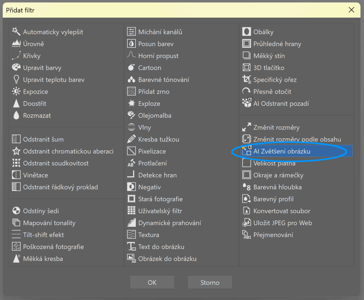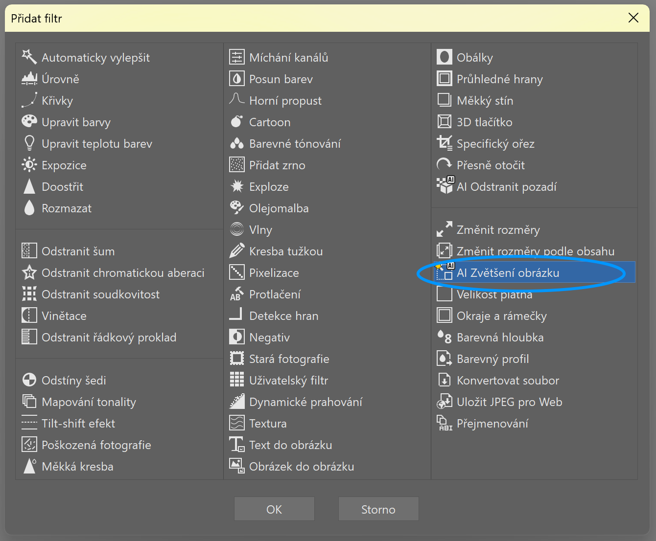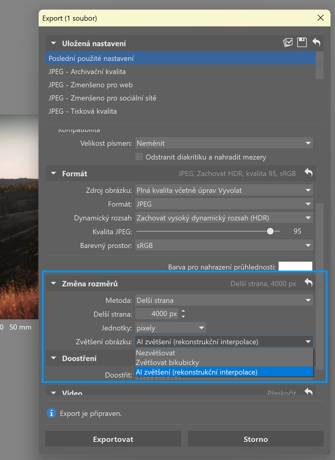 - Zvětšení fotek při exportu – citlivé zvětšení s AI rekonstrukcí nabídne lepší výsledek než klasická bikubická metoda.