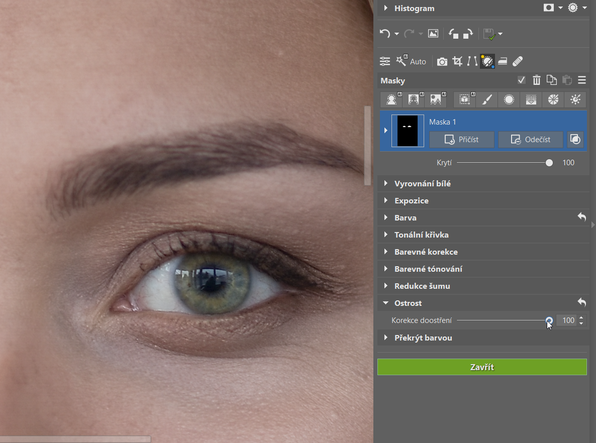 Posuvníkem Korekce doostření přidejte nebo uberte ostrost v konkrétní oblasti. Pokud to přeženete, jednoduše snižte krytí masky nebo dolaďte parametry.