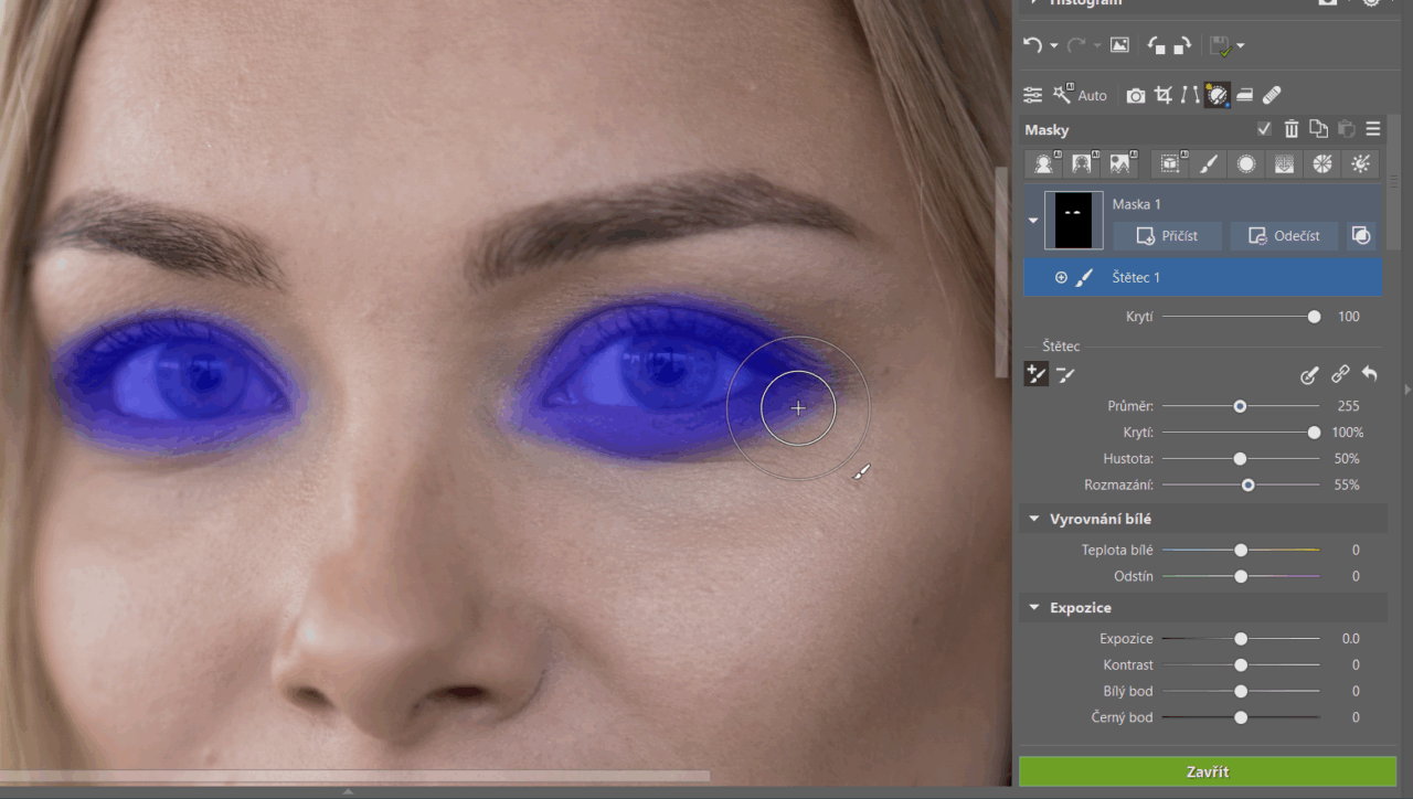 Někdy potřebujete zvýraznit jen určité části snímku – například oči, řasy nebo texturu vlasů. V takovém případě použijte Štětec (B) v modulu Vyvolat. Štětcem potom zamalujte oblasti, které chcete doostřit. Tím vytvoříte masku – všechny úpravy, které v ní uděláte, se projeví jenom zde a nikde jinde.