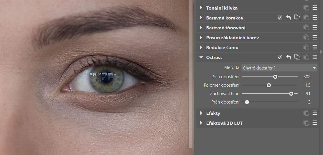 - Chytré doostření – navíc obsahuje parametr Zachování hran, který zabrání přeostření už ostrých oblastí. Ideální pro výraznější zásahy.