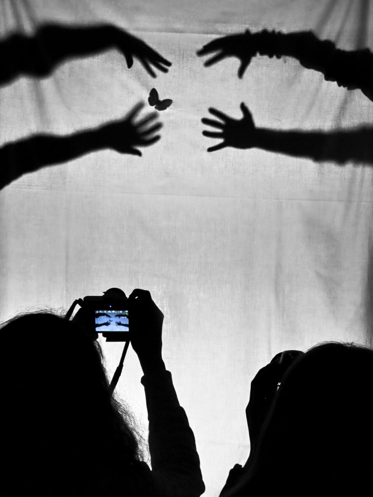 Chcete si opravdu vyhrát? Zkuste vytvořit domácí stínové divadlo. Stačí bílý papír nebo prostěradlo, silná lampa a několik figurek nebo vlastních rukou. Umístěte lampu tak, aby svítila zezadu. Mezi světlo a „plátno“ postavte rekvizity. Můžete nafotit třeba siluetu hmyzu, co vypadá jako z hororu, rukama tvořené zvířecí postavy nebo dramatické stíny každodenních předmětů. Foťte zepředu směrem na plátno a sledujte, jak se změní kompozice, když světlo posunete nebo přiblížíte figurky.