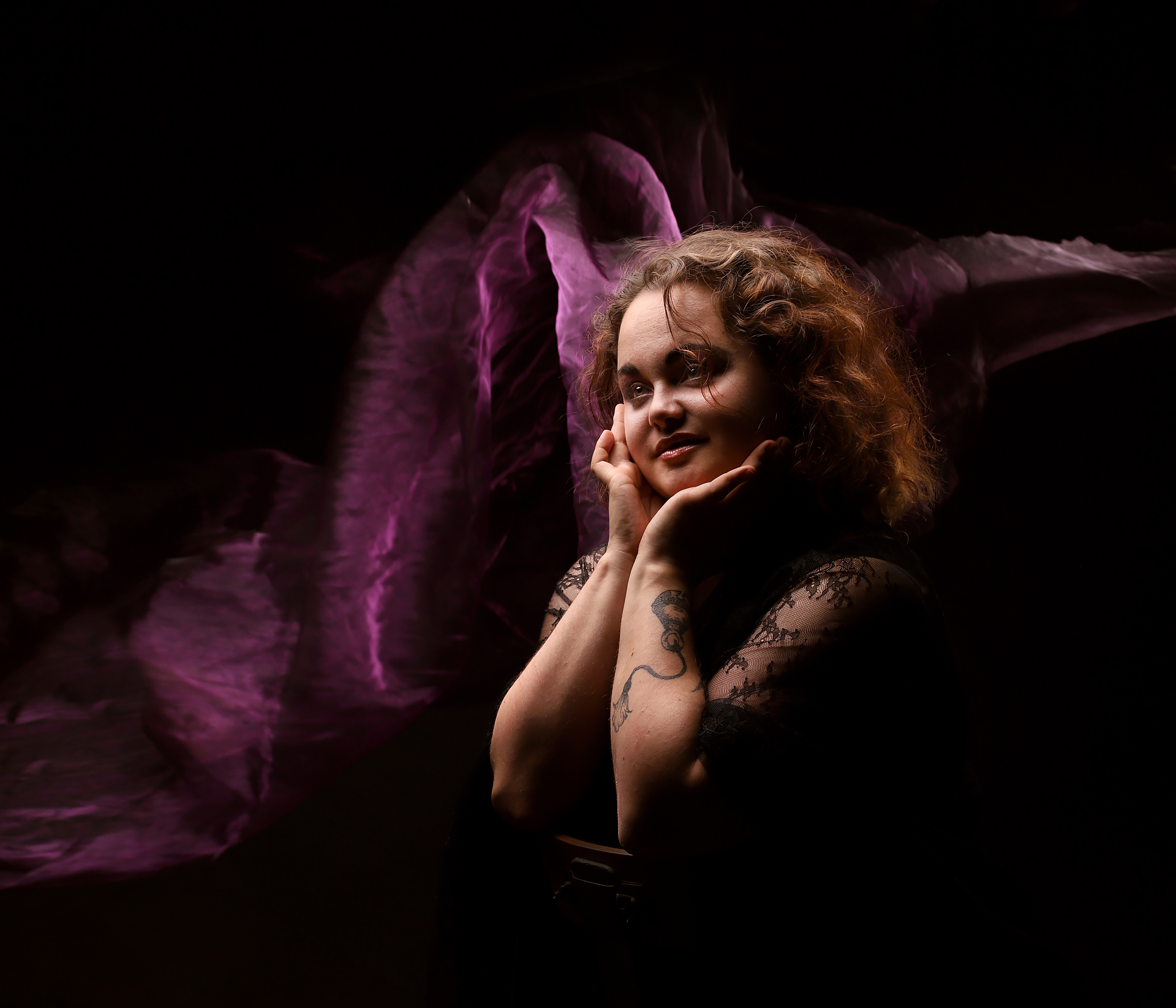 Dynamiku portrétu může výrazně ovlivnit letící látka v pozadí. Pokud máte asistenta, který se toho ujme, rozhodně to zkuste. Nejlépe se k těmto účelům hodí lehké látky, například organza.