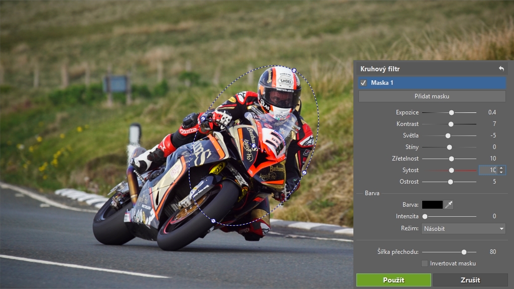 Vždy s ním zvýrazním prostor, který mě na fotce nejvíc zajímá. Tedy předek motorky a helmu závodníka. A to tak, že využiji prostor filtru k zvýšení Expozice a případně zesvětlení Stínů. Někdy také zvýším Sytost jako v tomto případě.
