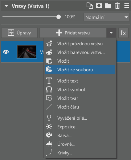 V modulu Editor v Zoner Studiu potřebujete dostat všechny vybrané soubory do vrstev, což uděláte tak, že nejprve otevřete první snímek v Editoru. Každý další obrázek pak vložíte jako novou vrstvu kliknutím na šipku dolů u textu „Přidat vrstvu“ a výběrem „Vložit ze souboru…“.