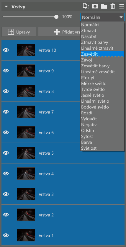 Důvod této změny je, že Normální režim vrstvy jednoduše překryje dolní vrstvu tou nad ní. Sice můžete procentuálně určovat Krytí a tím zobrazit stopy za auty z obou vrstev, ale vše bude působit vybledle. Na druhé straně, při zvolení režimu Zesvětlit se z horní vrstvy použijí právě ty pixely, které jsou světlejší než ty pod nimi. Každá zářící stopa auta se tedy zobrazí v plné síle.