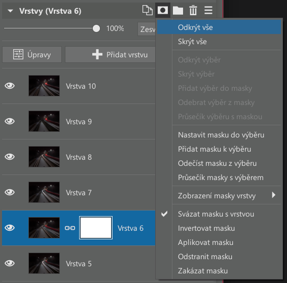 Znamená to vytvořit masku vrstvy, například kliknutím na ikonu masky v panelu vrstev a poté vybráním Odkrýt vše.