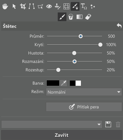 Vzniklá maska je zatím bílá, takže zobrazuje vše z vrstvy, jako kdyby žádná maska neexistovala. Jenže se dá do ní kreslit černým štětcem a tím měnit na černou v místech, kde chcete vrstvu zprůhlednit. Průměr štětce závisí na velikosti snímku a problémech, které napravujete. Důležité je Rozmazání, kde je bezpečnější nastavit alespoň 50 %, ať má štětec okraje plynule do ztracena. Krytí dávám na 100 %, ať problémy skutečně mizí a nejsou jen napůl viditelné. Nezapomeňte v panelu vrstev vybrat masku jako cíl pro kreslení (nekreslete do samotné vrstvy).
