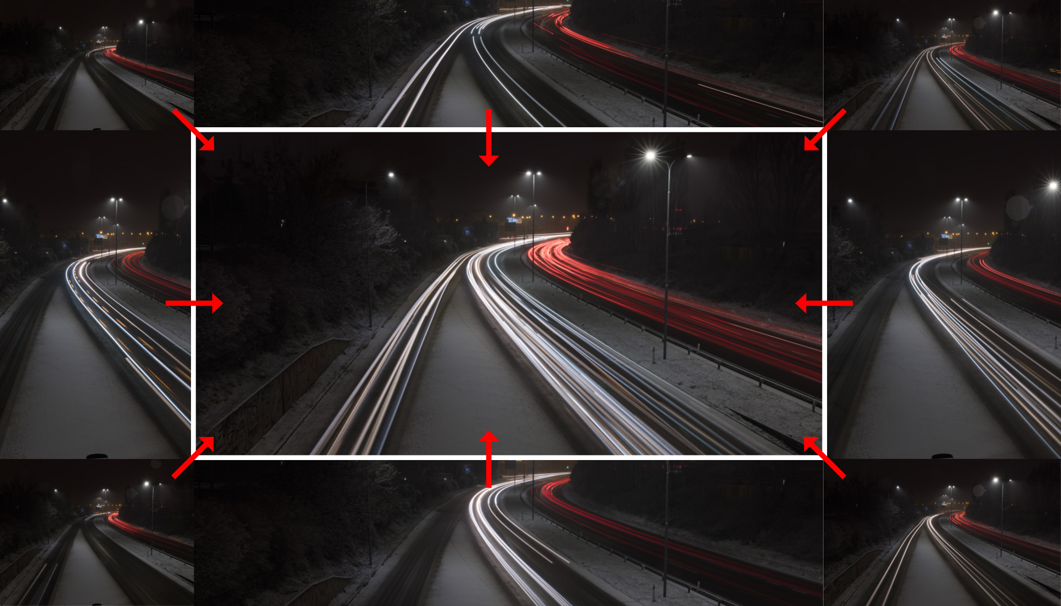 Velmi dlouhá expozice v řádu minut by sice zachytila spoustu světelných stop, ale zároveň by přesvětlila blízké domy, případně billboardy a cokoliv jiného světlého. Technicky by sice šlo použít ND filtr (neutrální šedý) na ztmavení, jenže ten by zase až příliš ztlumil světla jedoucích aut. Série snímků s kratšími expozicemi tento problém řeší.
