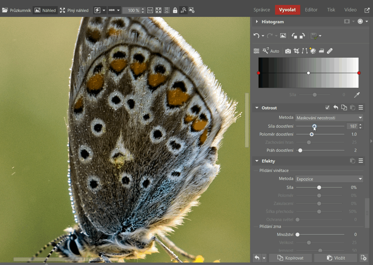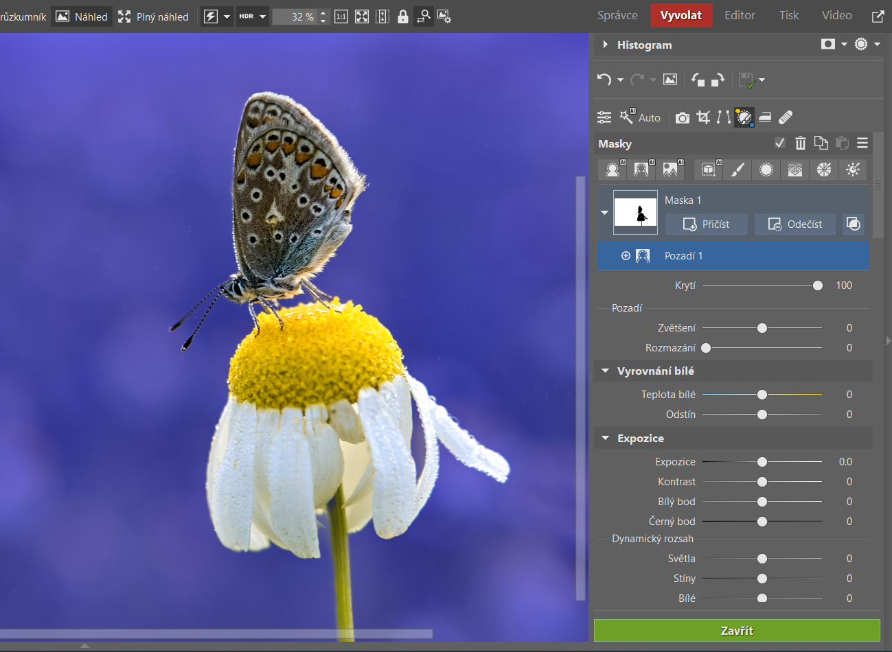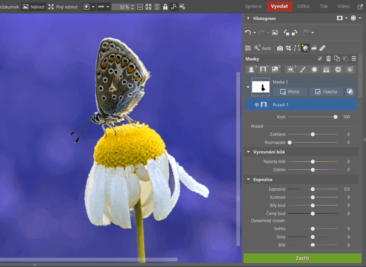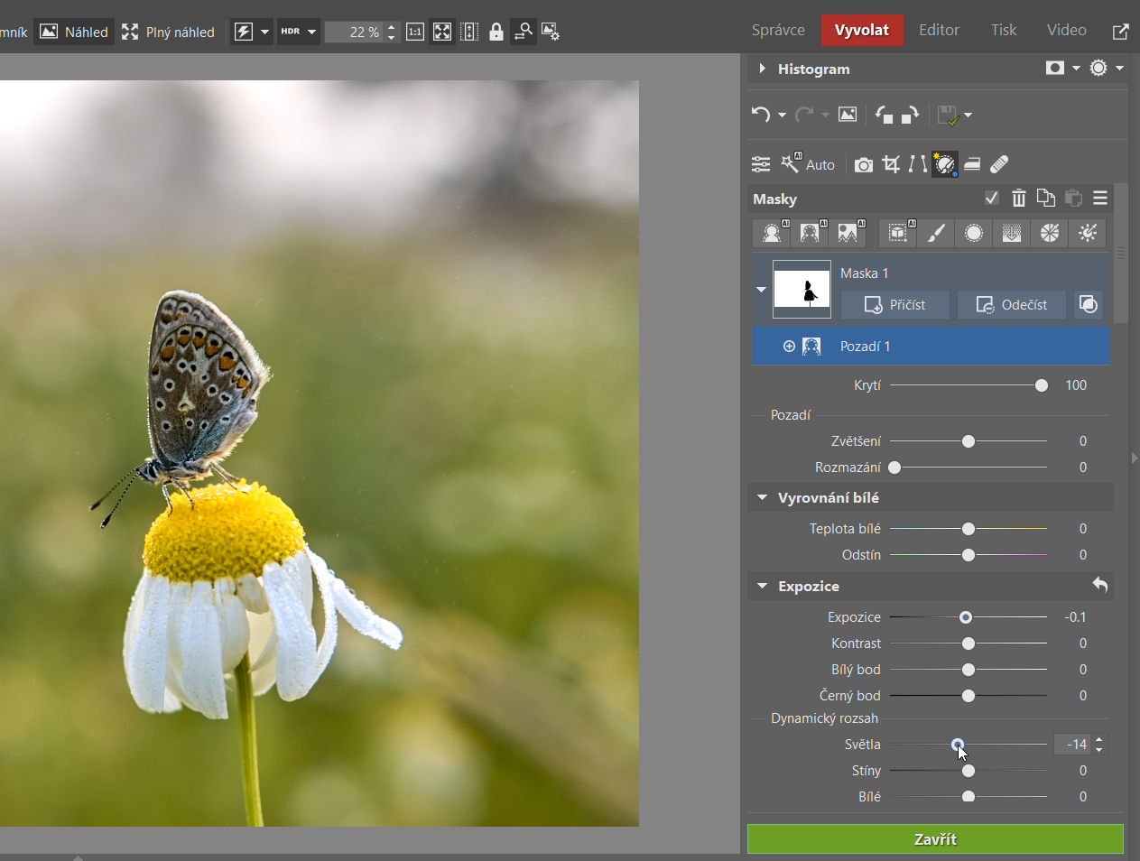 Často se také hodí upravit zvlášť konkrétní část fotky. Díky AI maskování to zvádnete doslova na pár kliknutí. My si u fotky chceme ztmavit pozadí, aby vynikl motýl a květina. Klikneme proto v pravém panelu Vyvolat na Lokální úpravy (L) a vybereme AI masku Pozadí.
