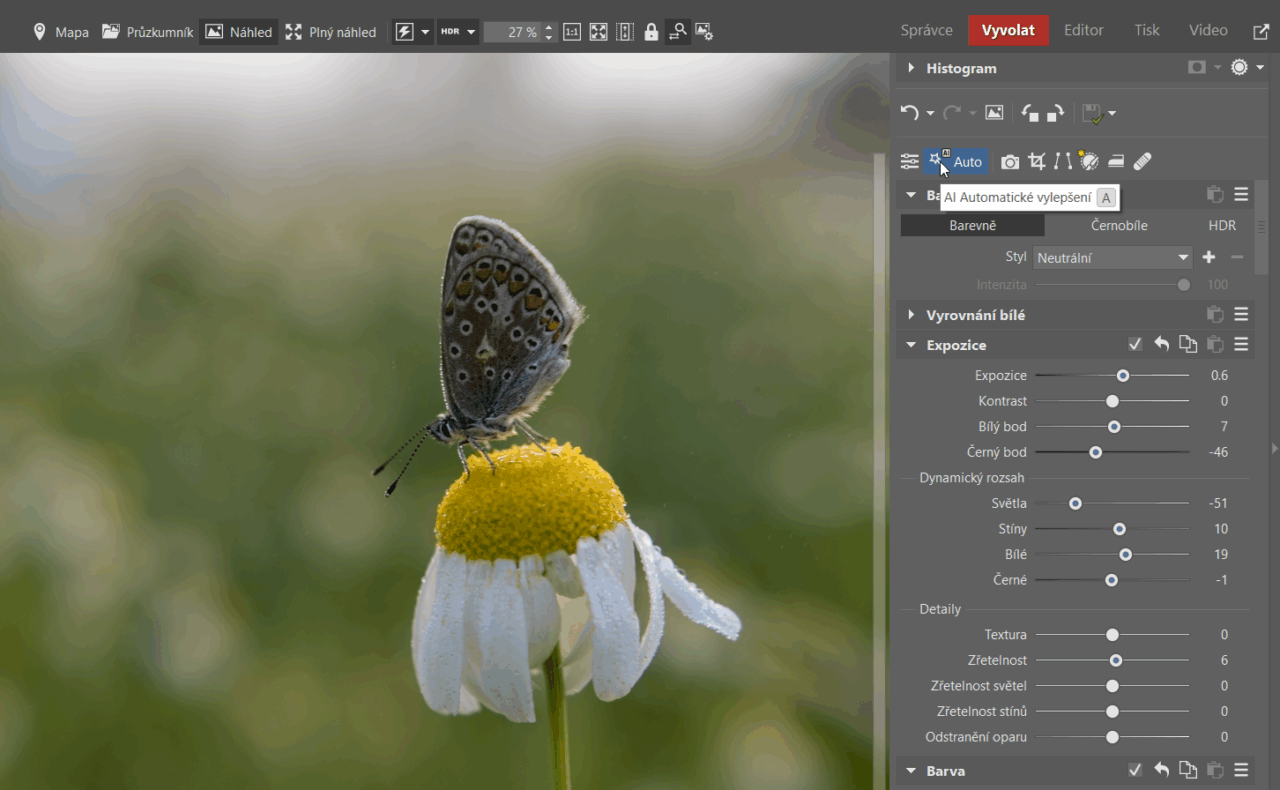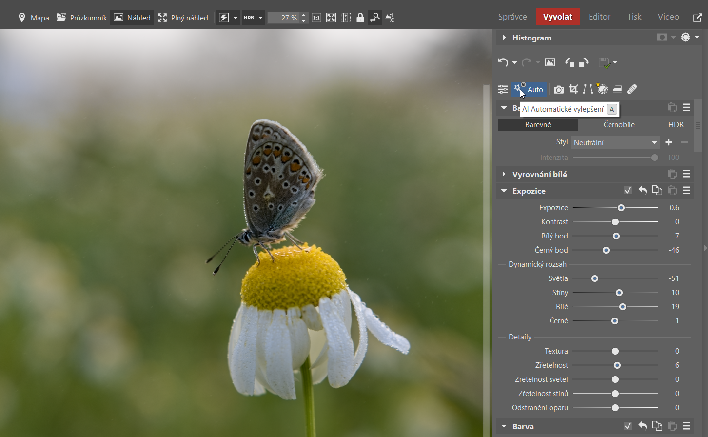 Jednoduchým a velmi účinným prvním krokem může být AI Automatické vylepšení (A). Podle svých algoritmů totiž Zoner Studio zpravidla pozná, jak expozici vylepšit. Tato automatická úprava se může stát dobrým základem pro další úpravy.