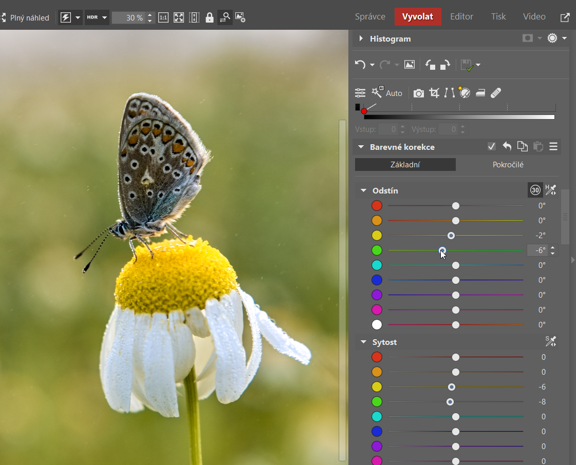 Občas se hodí i Barevné korekce jednotlivých barev. V tomto případě jsme posunuli žlutou a zelenou směrem do teplejších odstínů a stáhli jim sytost, protože byly příliš výrazné.