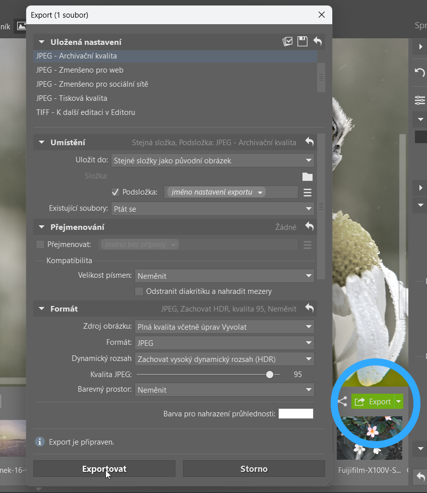 Jakmile jste s úpravami spokojení, klikněte na zelené tlačítko Export, které najdete ve spodním filmovém pásu, a uložte výslednou fotku. Pokud ale upravujete sérii fotek, je lepší nejprve všechny upravit a pak exportovat hromadně. A pokud jste snímky pořídili za stejných podmínek a se stejným nastavením, můžete využít i hromadné úpravy.