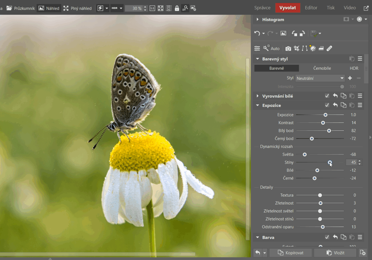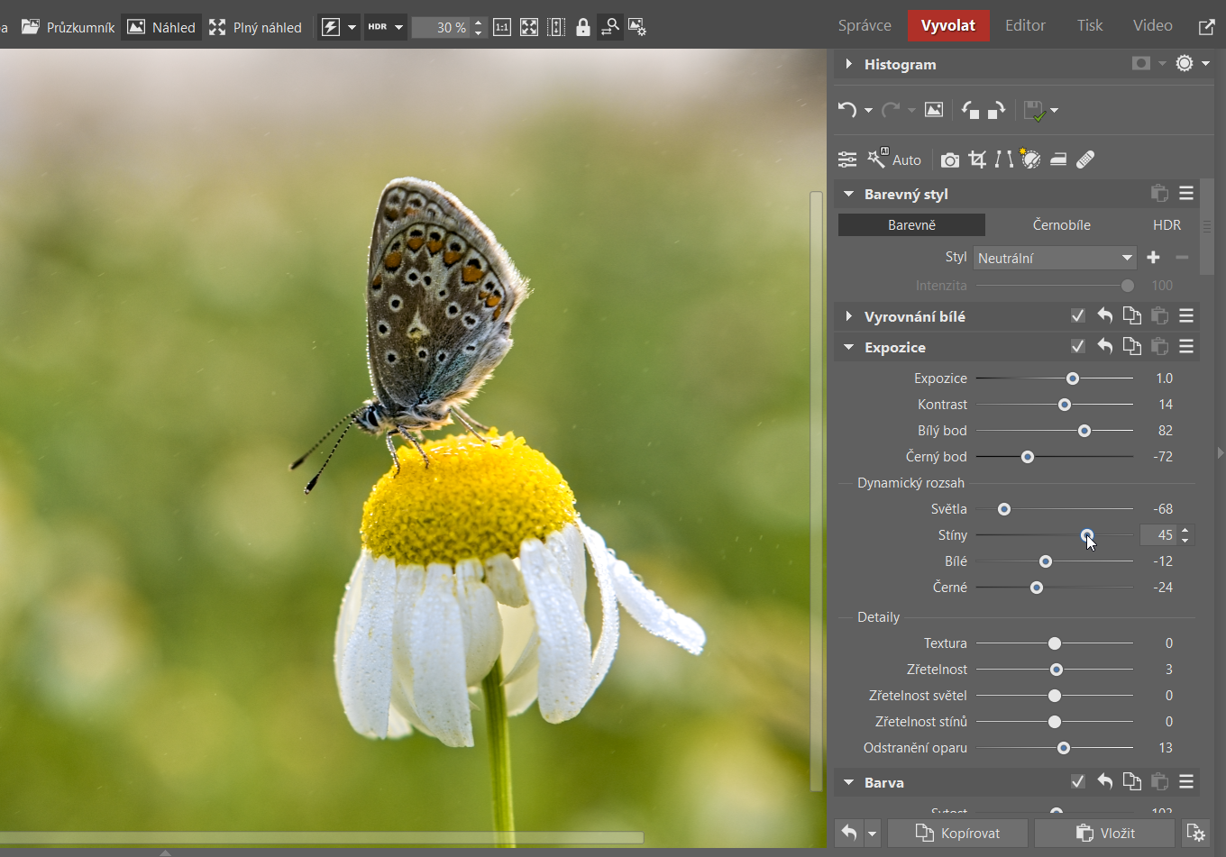 Expozici jsme sice upravili, snímku ale pořád něco chybí. Upravíme tedy barvy – zvýšíme Živost a Sytost.