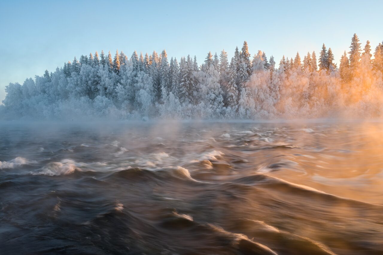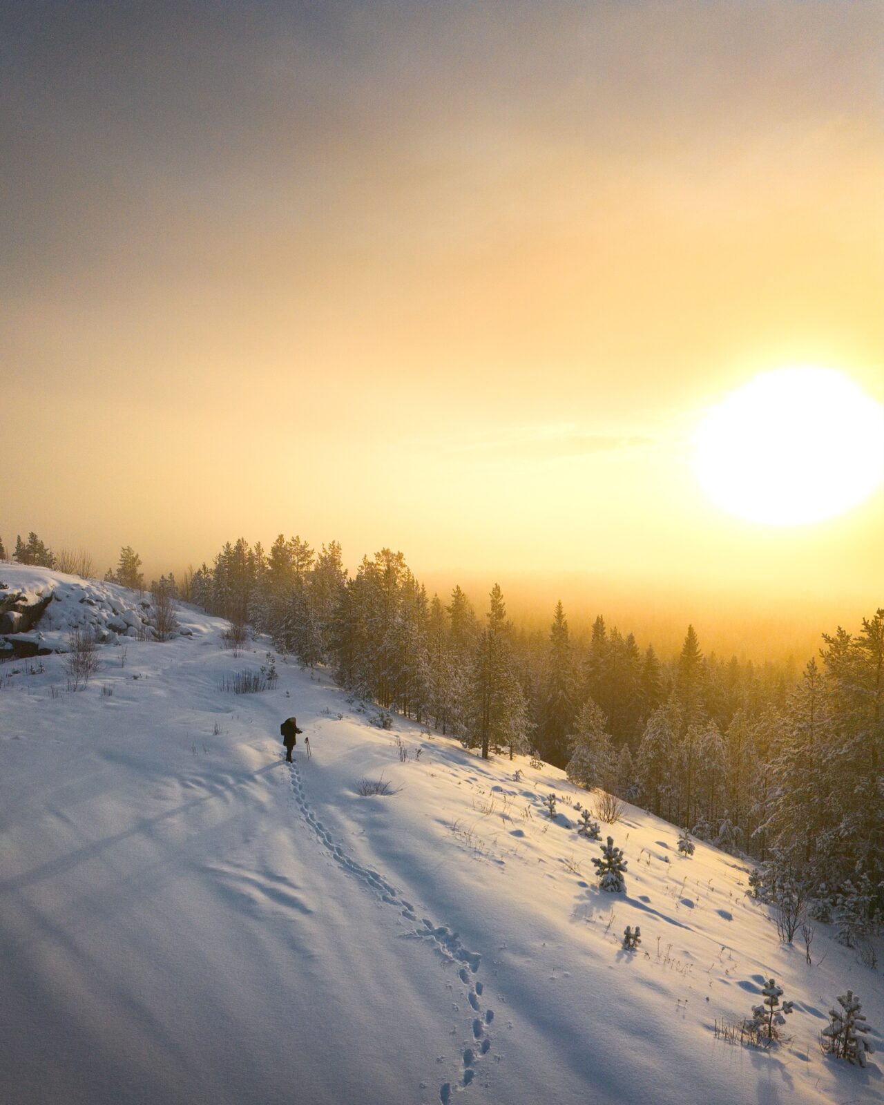Při fotografování zasněžených scén je ideální fotit při východu nebo západu slunce, pokud chcete své zimní snímky posunout na vyšší úroveň. I když neexistuje žádné pravidlo, které by zakazovalo fotografování během dne, měkké a barevné světlo v těchto hodinách dodá snímkům kouzelný nádech. Zasněžené scény mohou na fotografiích často působit příliš bíle a jednotvárně, ale focením během zlaté hodinky můžete do záběrů přidat dynamičtější barevnou paletu.