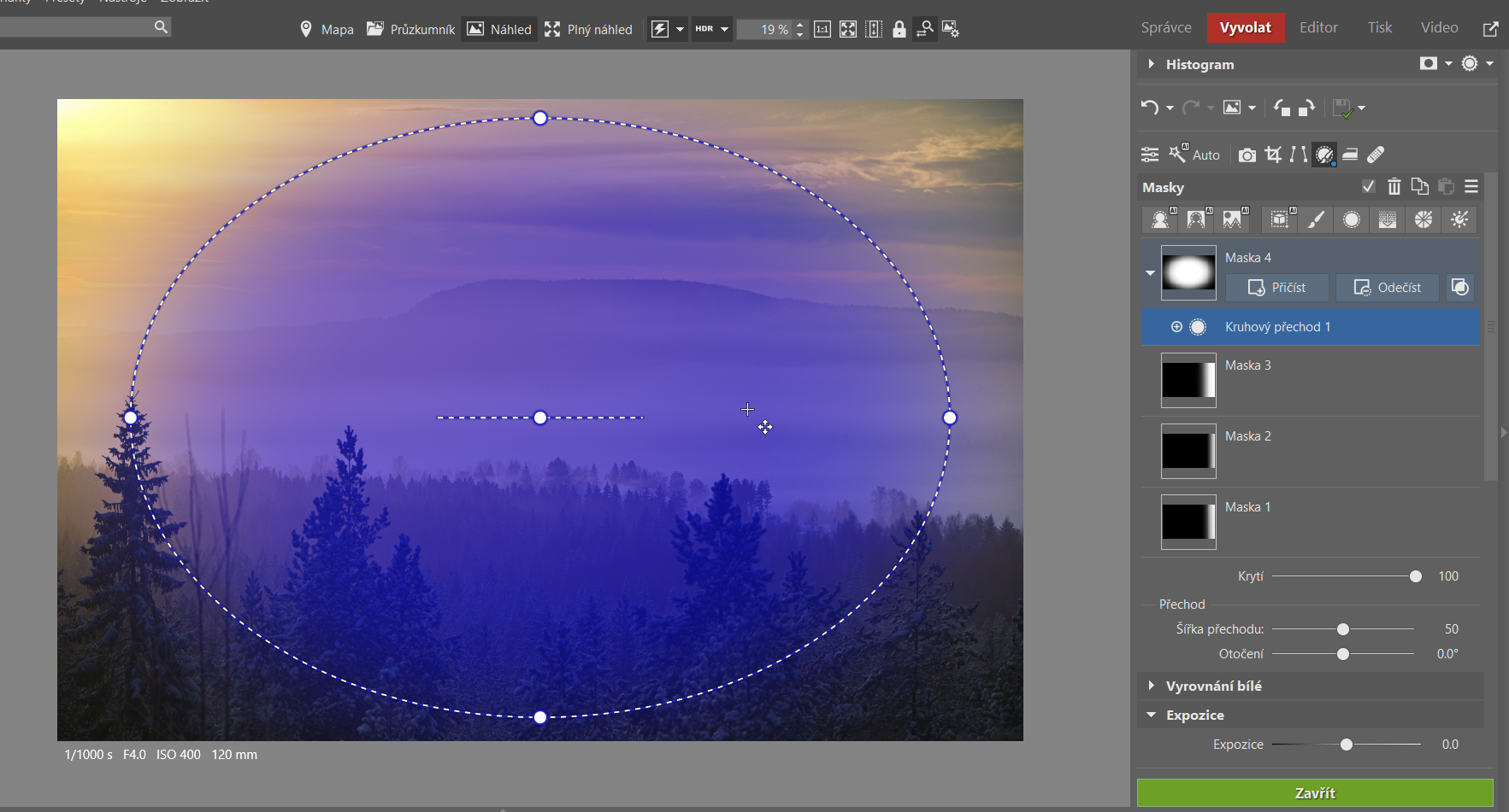 V tomto příkladu jsem použil velký Kruhový přechod se zvýšením expozice o +0,4 ve středu snímku, aby se zdůraznil přirozený zdroj světla. Používání Kruhových přechodů ke zvýraznění klíčových prvků v zimních fotografiích je účinný způsob, jak přitáhnout divákovu pozornost ke konkrétním oblastem. Zde jsem chtěl zdůraznit stromy vystupující z mlhy a vzdálenou horu, aby se staly hlavním motivem snímku.