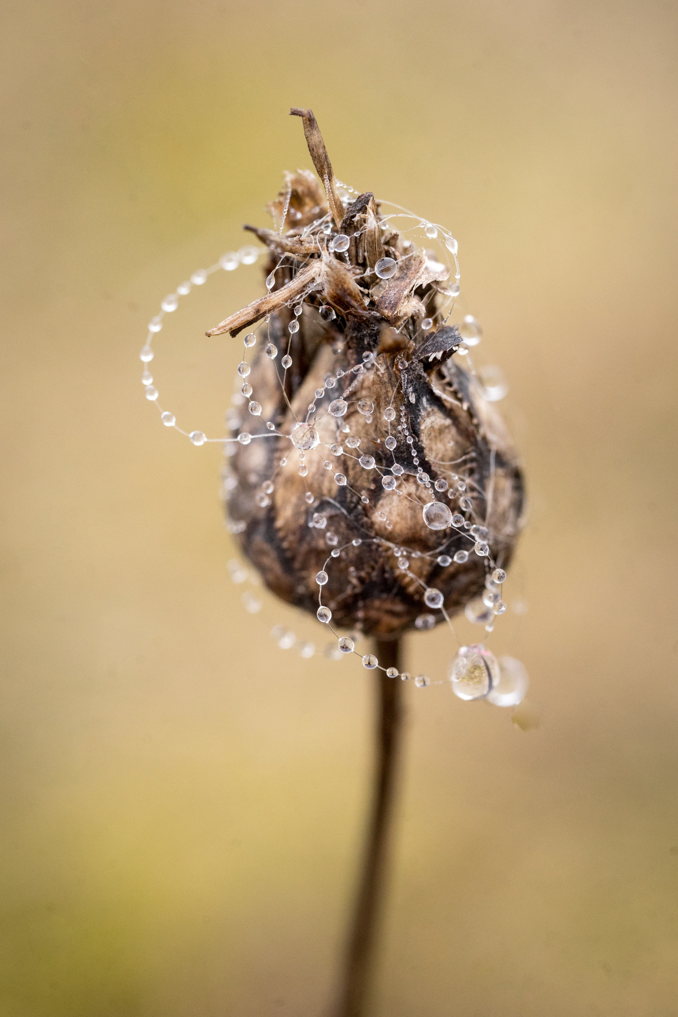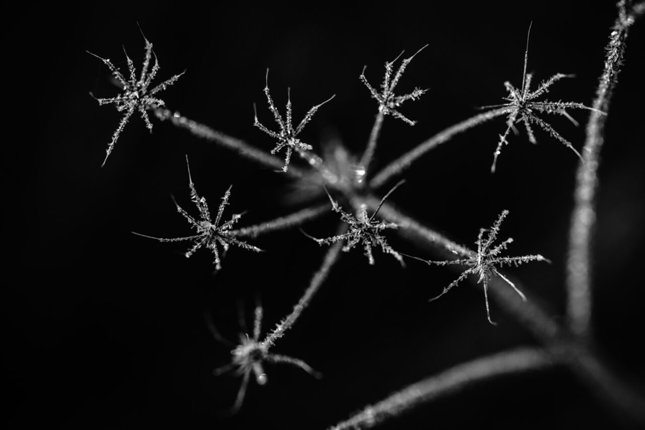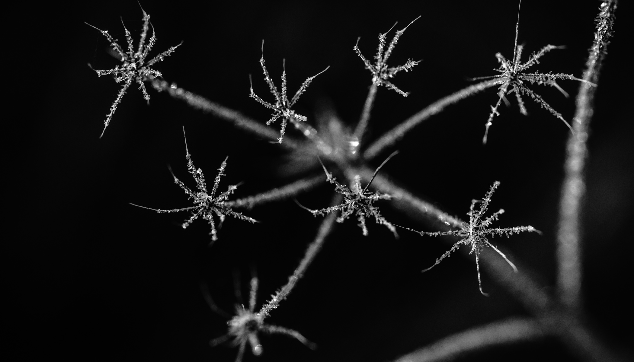 Zima na první pohled působí chudě – málo barev, málo rostlin, málo pohybu. Ve skutečnosti je ale plná detailů, které v jiných ročních obdobích nenajdete. V jinovatce objevíte jemné i pichlavé tvary a led v sobě skrývá zamrzlé bubliny i květy rostlin. Zimní makro bývá minimalistické, v čistotě vynikají struktury a také kapky tajícího ledu promění obyčejnou větvičku nebo zmrzlou trávu v překvapivě fotogenický motiv.