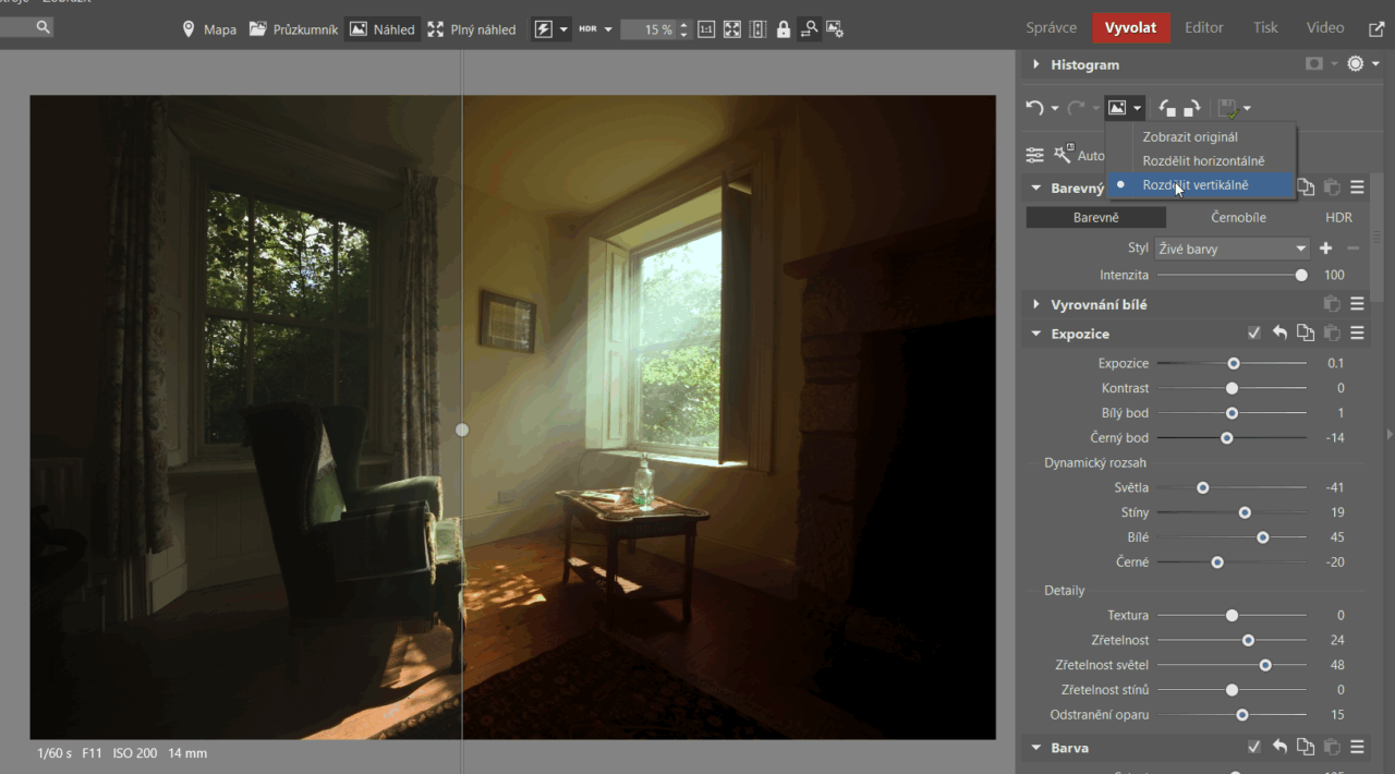 Ještě praktičtější je ale nový split view – rozdělené zobrazení, které ukáže snímek „před“ a „po“ vedle sebe, buď vertikálně, nebo horizontálně. Hranici porovnání si můžete libovolně posouvat a sledovat jen tu část, která vás zajímá – třeba pleť, oblohu nebo kontrastní přechody.
