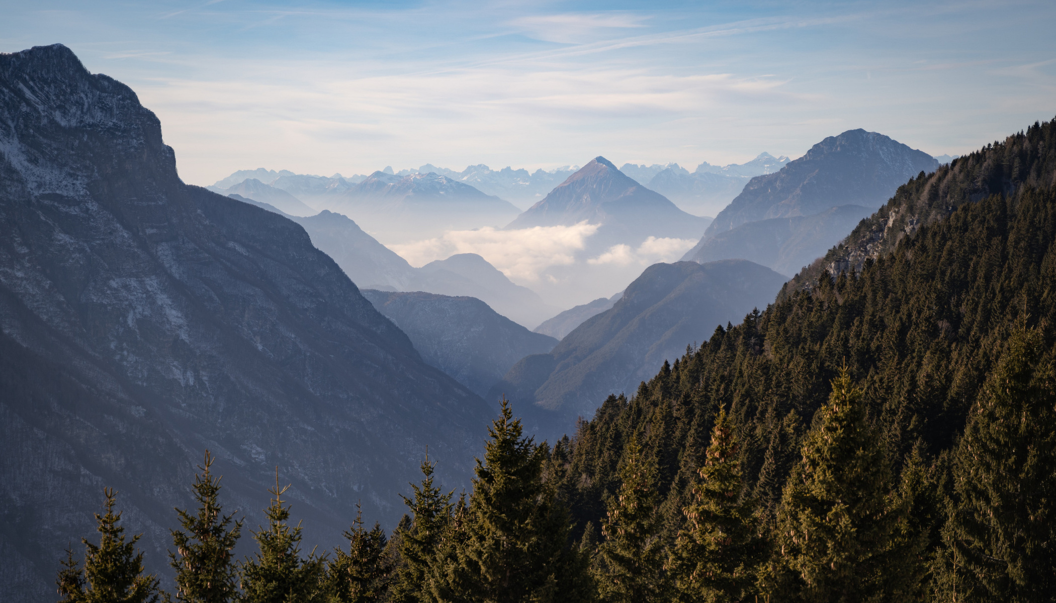 Trojúhelník: V horské krajině se velmi dobře uplatňuje také kompozice do trojúhelníku. Nejde o formální pravidlo, ale o práci s tvarem, který je horám přirozený. Trojúhelníky lze hledat vědomě, ale často vznikají samy – stačí si v hledáčku všímat tvarů svahů a vrcholů a nechat je „poskládat“ obraz přirozeným způsobem.