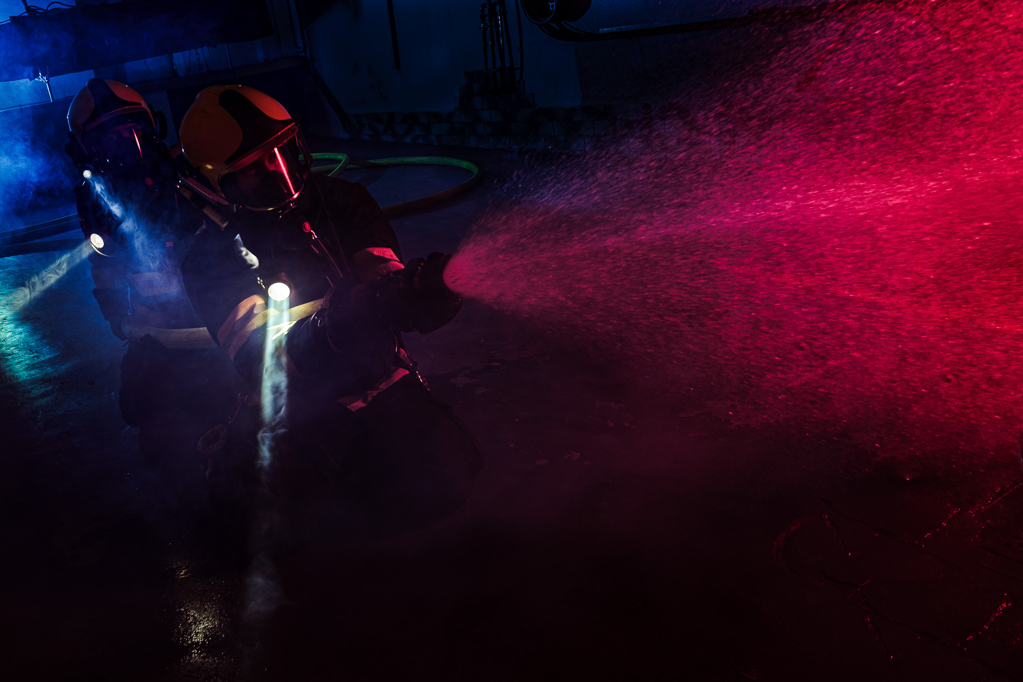 Důvod byl prostý. Hasiči obvykle postupují od modře blikajících aut k červenému ohni. Na některých snímcích jsem se dokonce nebál blesk přiznat do záběru. V zakouřeném prostoru totiž skutečně připomíná majákové světlo.