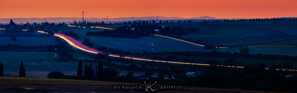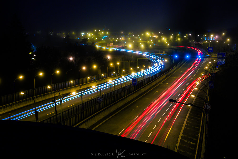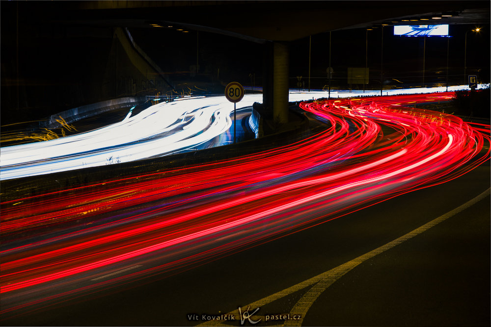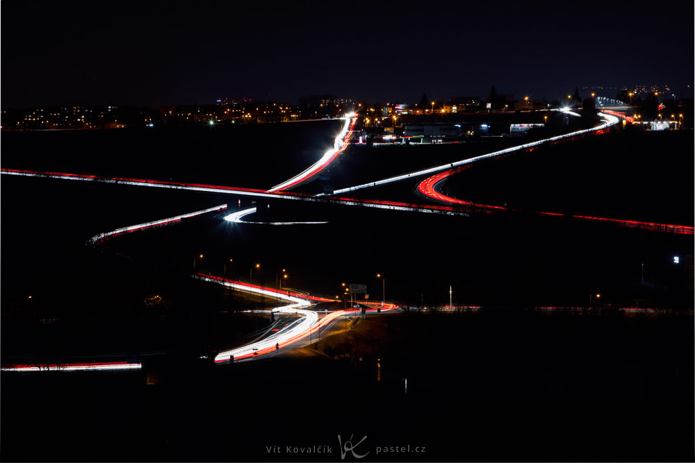 Světelné stopy focené z úrovně aut většinou nebývají příliš zajímavé. Jednotlivé pruhy světel splývají a všechny linie se soustředí do úzkého koridoru uprostřed snímku.