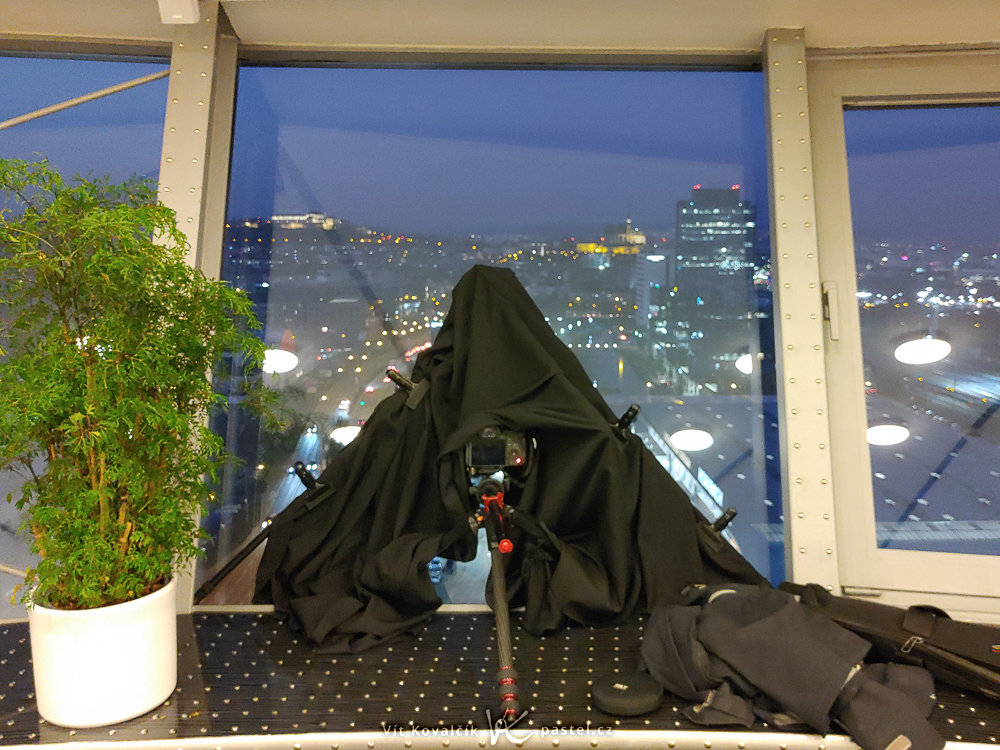 Focení z oken je pohodlnější, ale většinou nabízí omezenější výhled. Také se může stát, že budete nuceni fotit za zavřeným oknem – ideální období je přece jen zima. Pak je nutné řešit odrazy interiéru i lom světla na skle, který dokáže silná světla před vámi zdvojit. Proti odrazům pomáhá tmavá látka kolem objektivu nebo jednoduchý „černý tunel“, který se přiloží ke sklu.