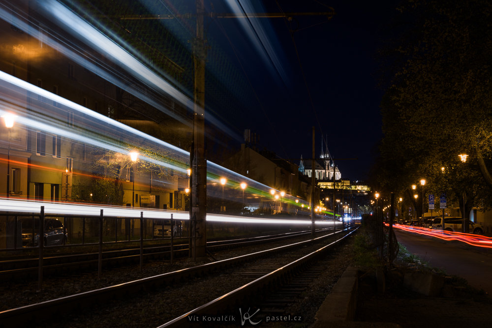Existuje ale výjimka: pokud jste dostatečně blízko a mezi auty jsou i vyšší vozy, jako kamiony, autobusy nebo tramvaje. Jejich světla, rozložená po větší ploše, dokážou vytvořit působivé linie pracující s perspektivou. MHD má navíc tu výhodu, že poměrně přesně víte, kdy kolem projede.