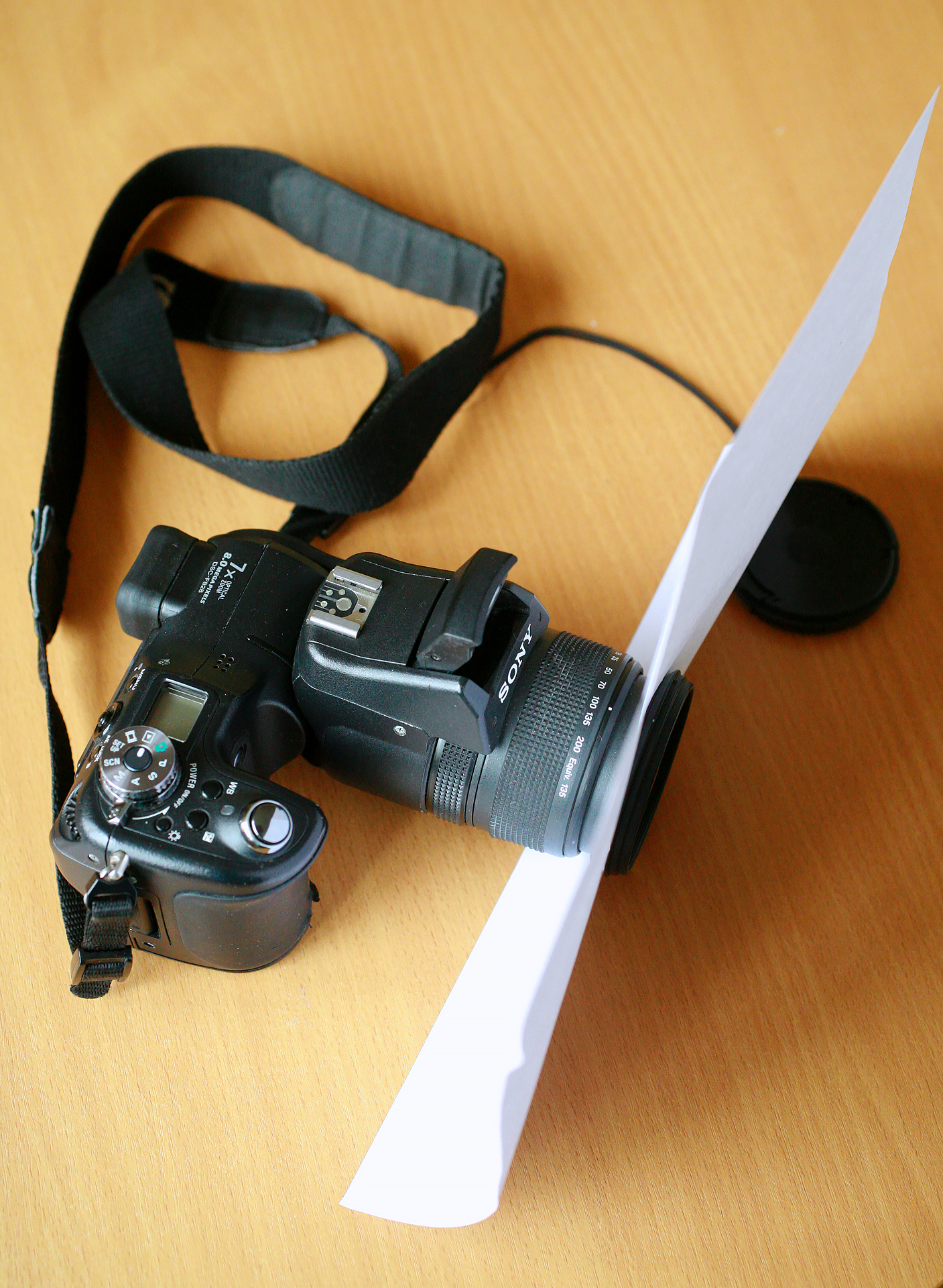 Než lepidlo zaschne, ohneme rohy – na jedné straně více, na druhé méně. Kartičku pak přiložíme k blesku tou více ohnutou stranou a nasměrujeme světelný paprsek na stěnu.